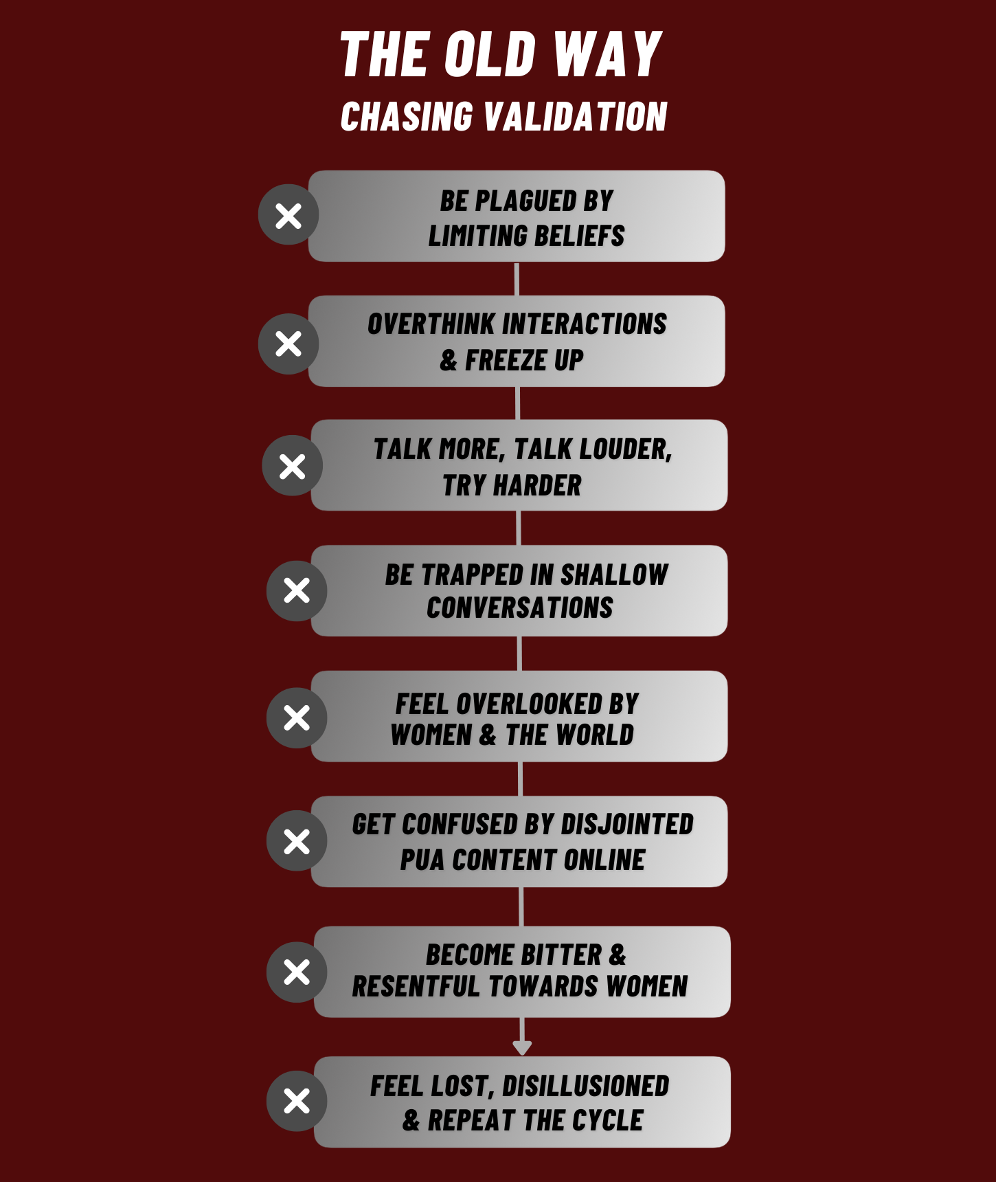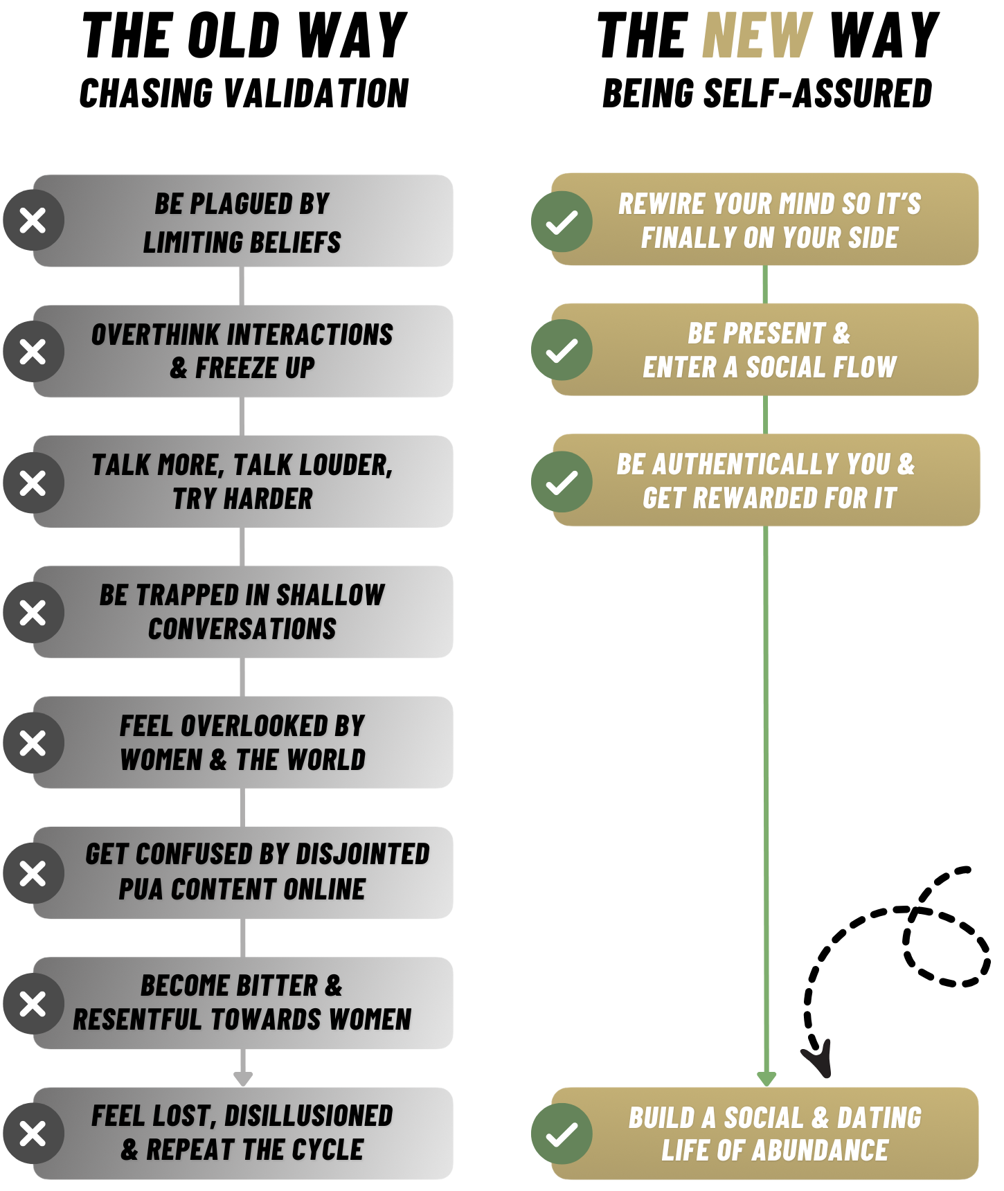 The way we do this is by rewiring your mindset, mastering your presence and social skills, understanding real female psychology, and applying everything through simple, real-world action steps