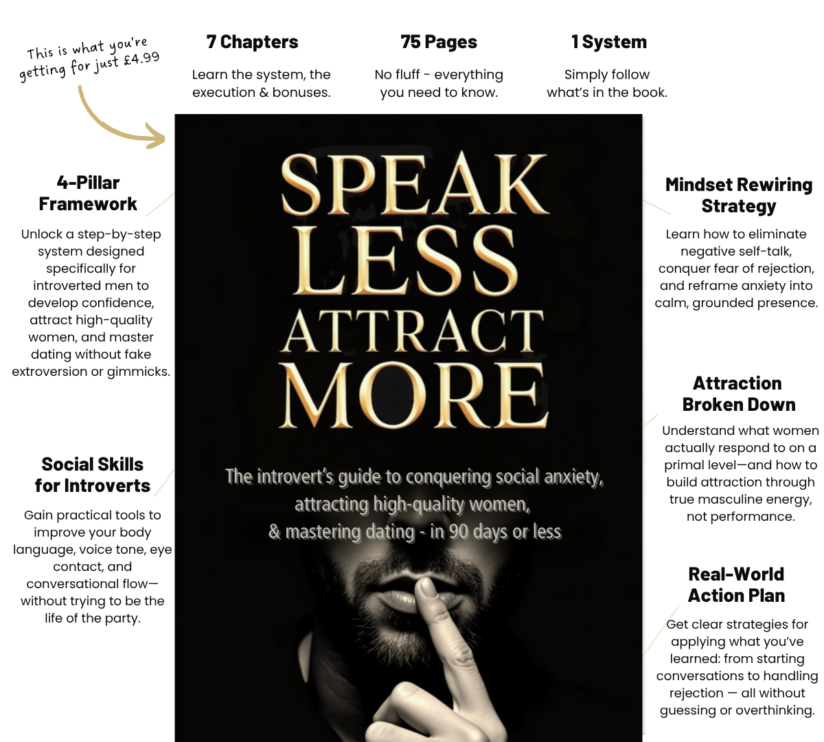 Once you grab your copy of Speak Less Attract More & follow the steps inside of it, you’ll finally be able to stop overthinking & self-sabotaging your social & dating life.